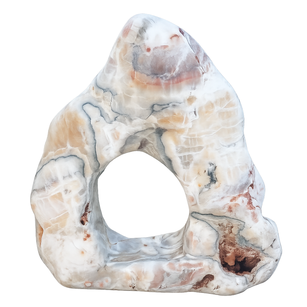 A naturally sculpted banded onyx statement piece, carved into a bold triangular form with a smooth central aperture that frames light and shadow beautifully. The stone’s creamy whites and warm honey tones are traced with fine charcoal-grey veining and subtle russet accent each line a one-off signature created by nature, so no two pieces are ever the same. This exquisite piece is approximately one meter height and weighs well over 100kg